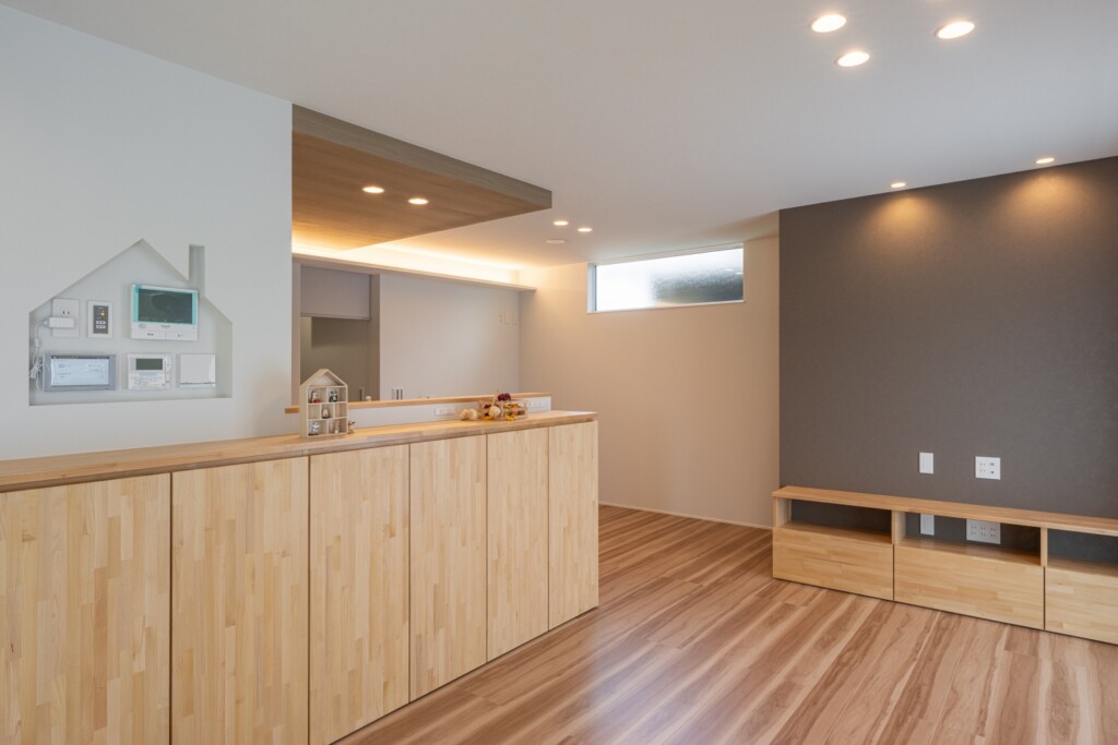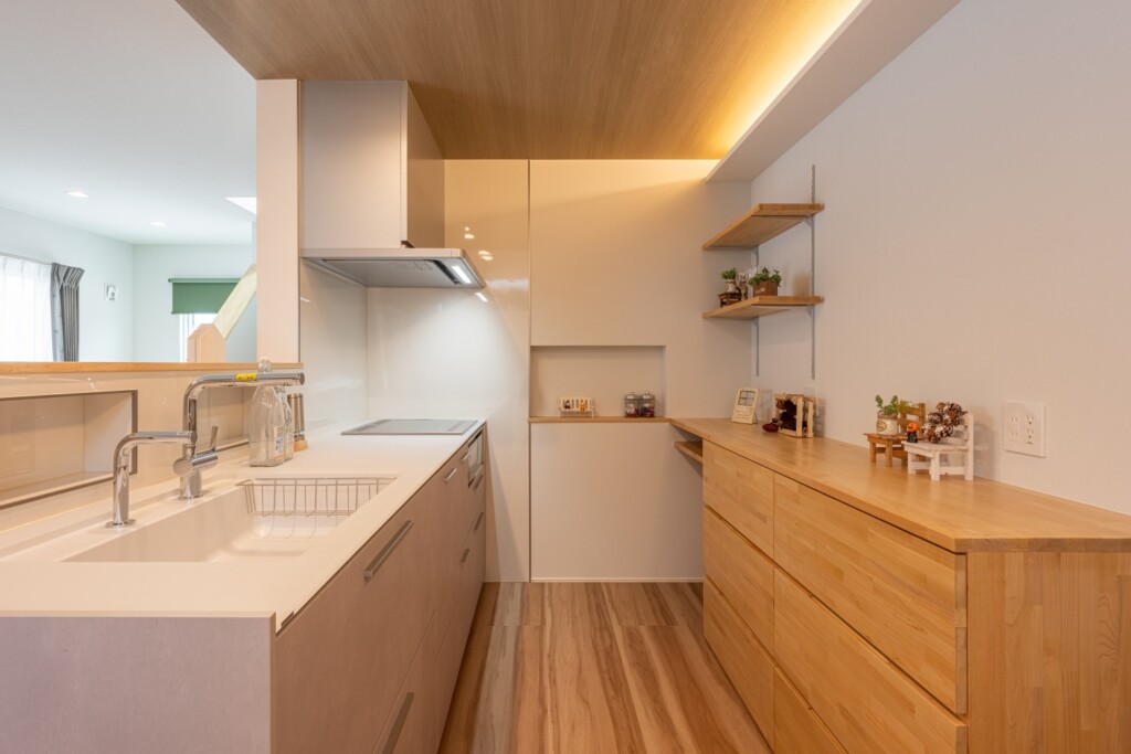 造作のカップボードが特徴のキッチン。奥に見えるニッチの壁やウォールシェルフで見せる収納も可。インテリアを楽しめる素敵な空間に。