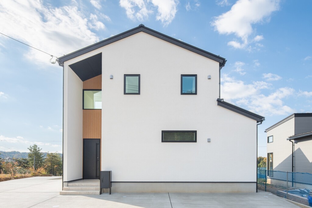 玄関部分の木目がアクセントになりかわいらしい雰囲気の外観。
