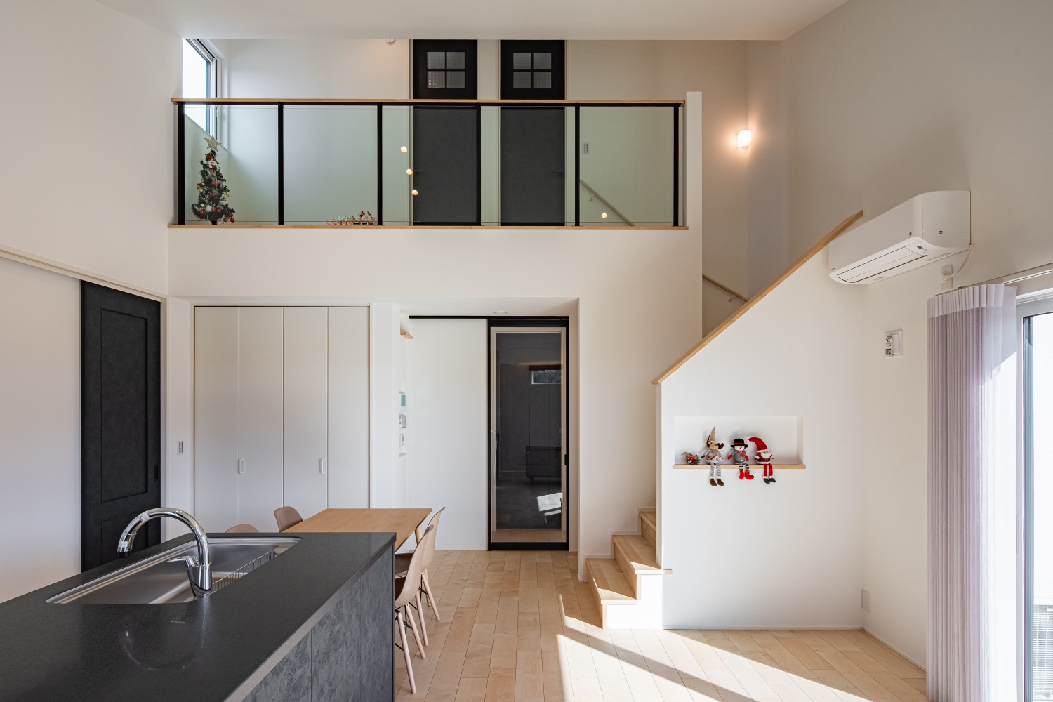階段を上がると1階の様子が見えるので、いつでも家族の存在を感じられて安心感がある。