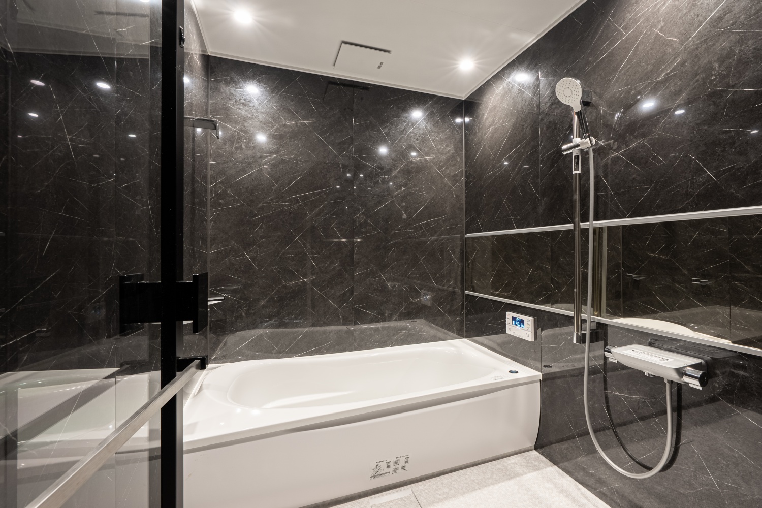 黒をメインとしたお風呂はおしゃれでカッコ良く、ホテルライクな雰囲気に。