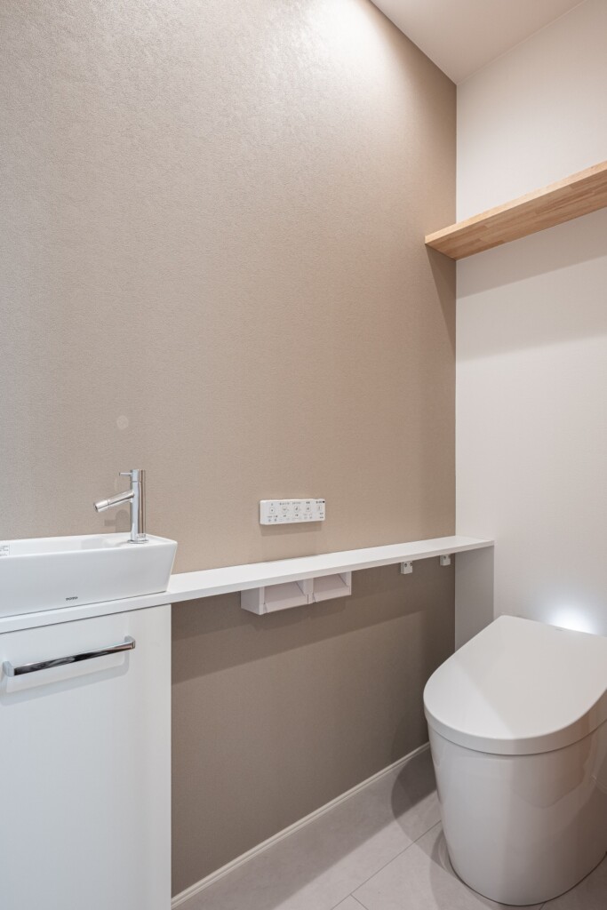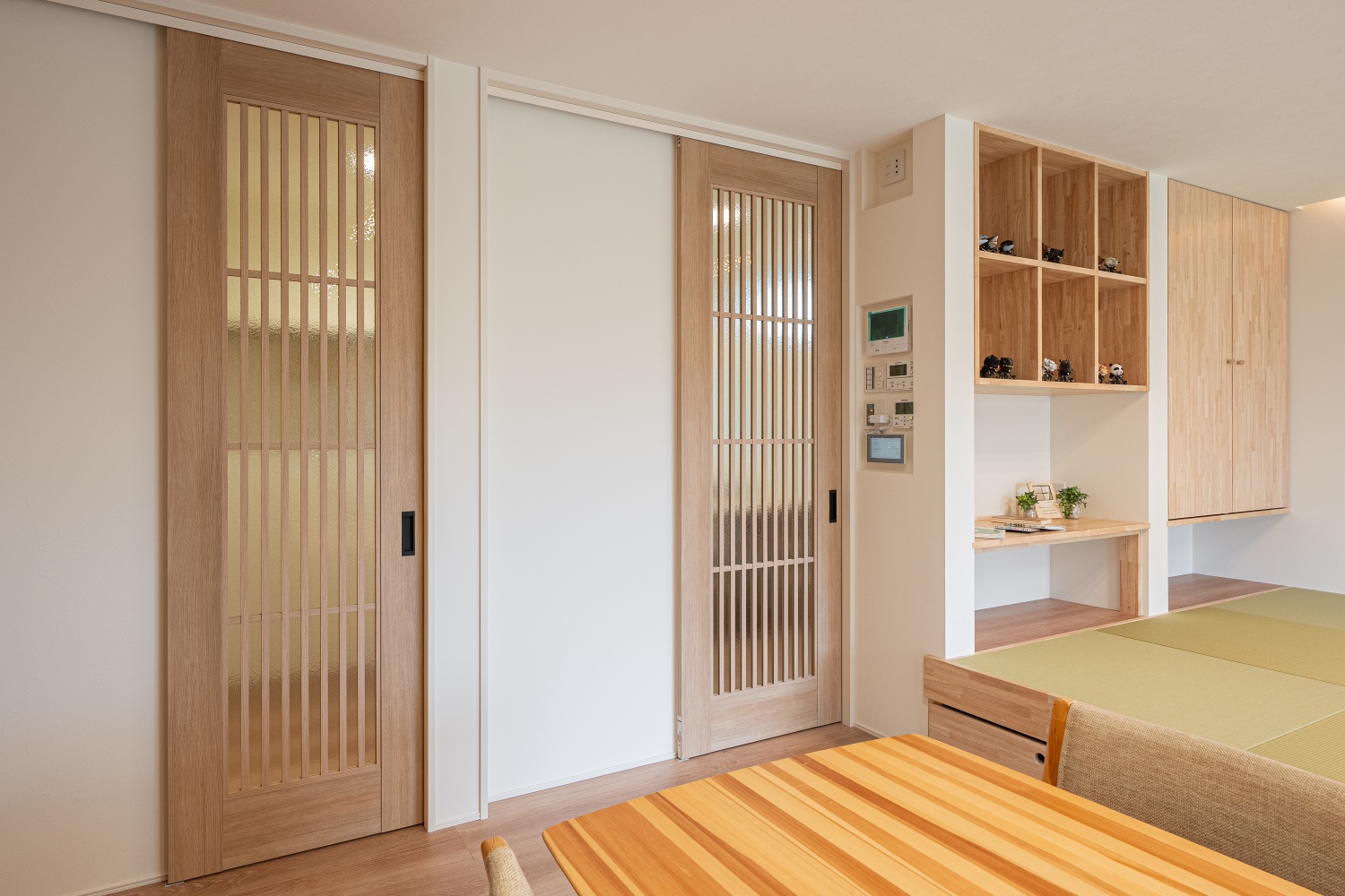 木目の縦格子デザインを取り入れたドアは、空間をやわらかく仕切りながら和モダンな雰囲気を演出しています。