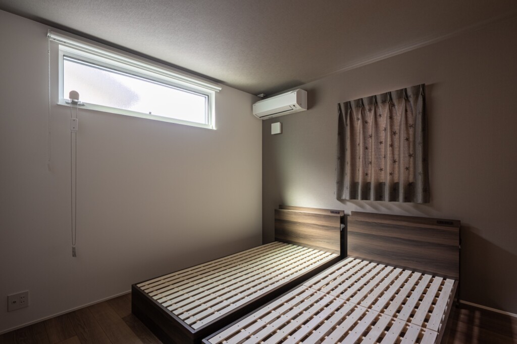 クロスを暗めにして、心地よい空間の寝室。